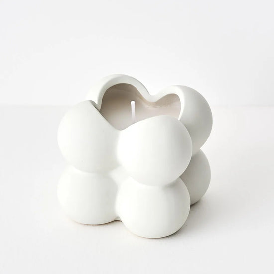 This hand-poured candle is nestled in a uniquely designed ceramic pot, featuring a modern, cloud-like cube shape.