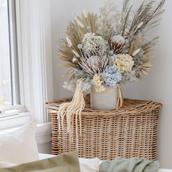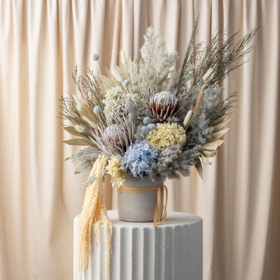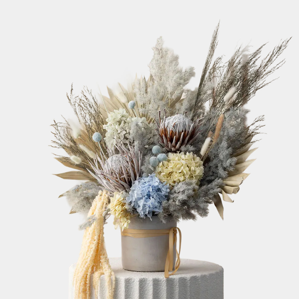Styled in a matte stone pot and tied with a golden ribbon, it blends creamy hydrangeas, frosted proteas, airy pampas, and icy blue accents. Textures of bleached foliage and cascading amaranthus add depth and movement, while muted tones of ivory, blue, and soft beige create an elegant, timeless aesthetic. Perfect for interiors that call for calm sophistication — a piece that brings everlasting beauty and serene luxury to any space.