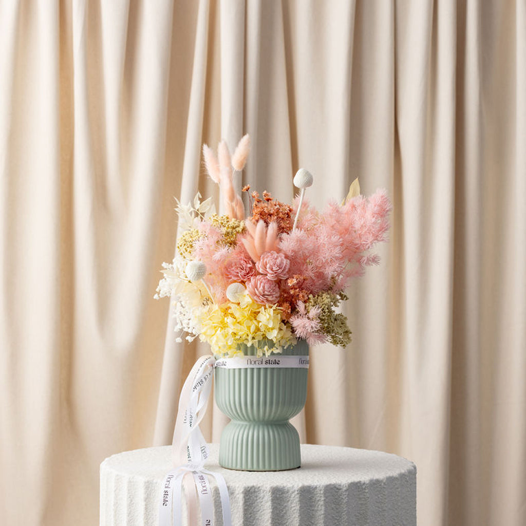 A delicate celebration of spring, captured in timeless preserved blooms. This petite arrangement features soft seasonal tones and textures, thoughtfully styled to bring a touch of everlasting beauty to any space. Perfect for gifting, brightening a desk, or adding a subtle pop of colour to your home décor. Low-maintenance and long-lasting, it’s a sweet little piece that keeps spring alive all year round.