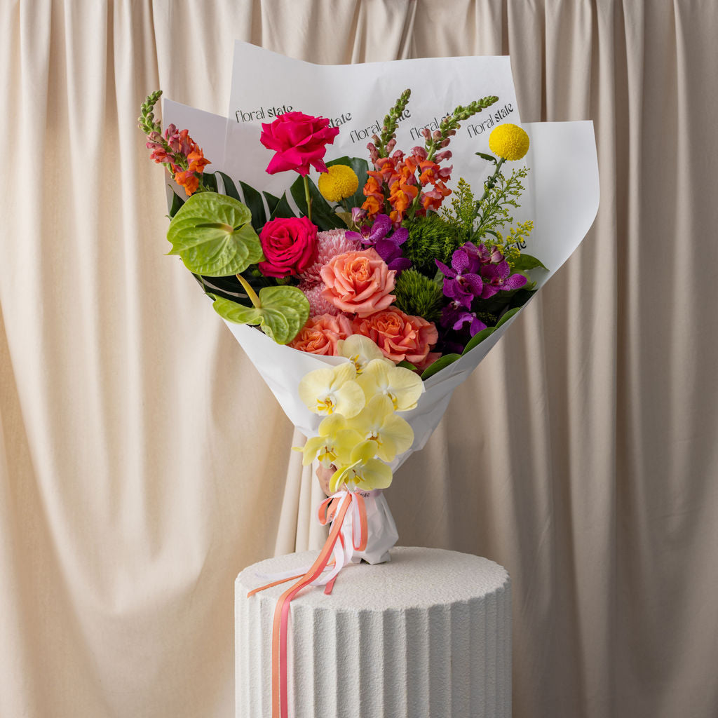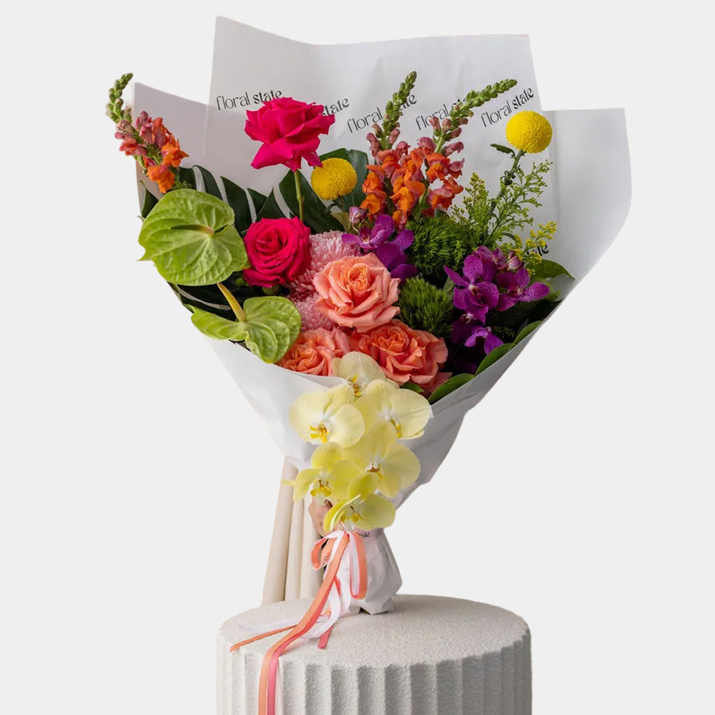 A lively bouquet filled with summer’s boldest colors—vibrant pinks, sunny oranges, and cheerful yellows—woven together with fresh greenery. Perfect for brightening a room or gifting a burst of joy, this bouquet captures the carefree, radiant spirit of summer.