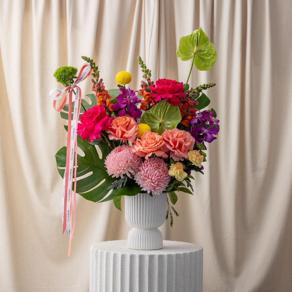 A joyful mix of vivid summer flowers in a stylish vase, radiating warmth and energy. Bursting with bright pinks, oranges, and yellows, this arrangement brings the essence of sunny days indoors—fresh, cheerful, and full of life.