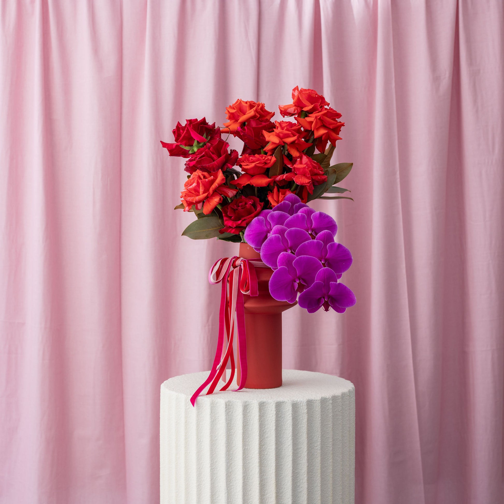 A striking statement of love, this lush bouquet features premium long-stem roses in rich tones of crimson, scarlet and warm coral. Hand-gathered for maximum impact, the roses are layered with depth and movement, then wrapped in crisp white paper and finished with soft pink and red ribbon detailing.