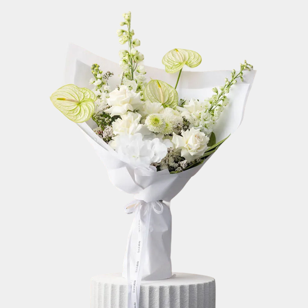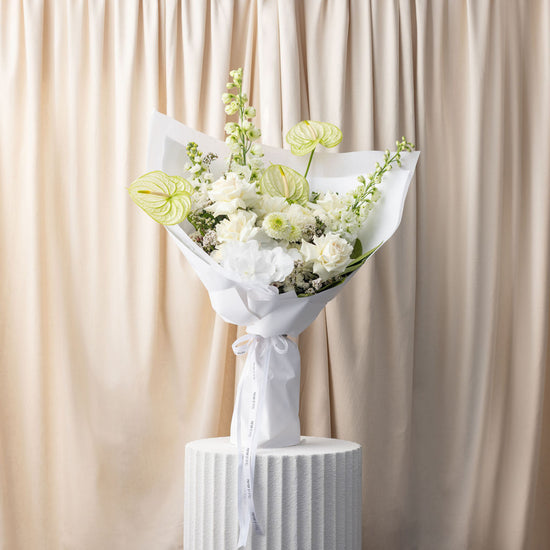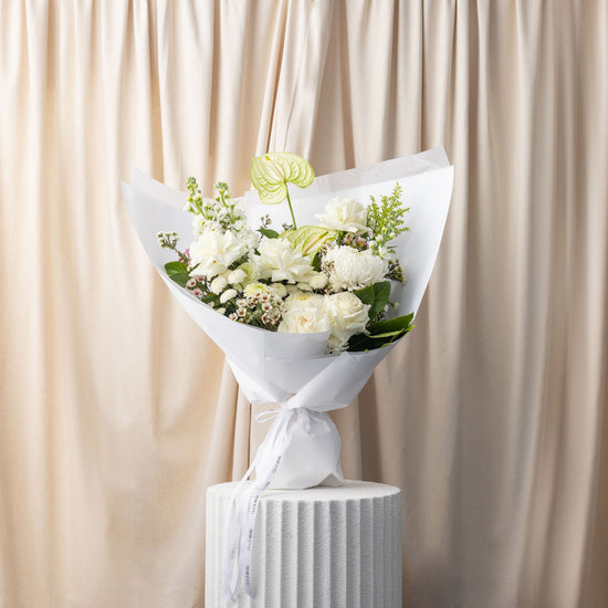 A timeless all-white bouquet composed of elegant seasonal florals. Clean, refined and beautifully versatile, White Blooms bring a sense of calm luxury to any setting.