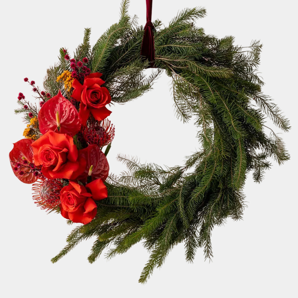 Welcome the season in style with our Fresh Christmas Wreath — a lush, handcrafted design made with fragrant pine, spruce, and seasonal foliage. Adorned with fresh blooms such as roses, chrysanthemums, and berries, it’s finished with festive touches of ribbon, pinecones, and natural textures for a beautifully balanced look.