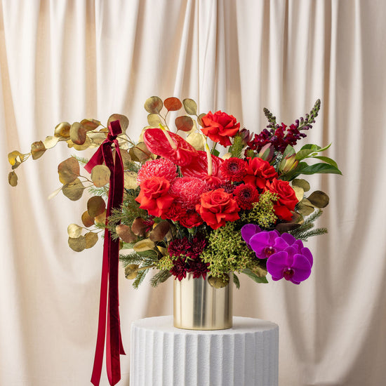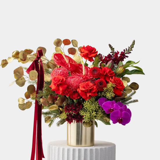 Bring festive luxury into your home with our stunning Red & Gold Christmas Vase Arrangement — a timeless blend of warmth, elegance, and seasonal cheer.This statement piece features rich red blooms, preserved foliage, and golden accents that shimmer beautifully under holiday lights. Designed in a stylish vase, it’s the perfect centrepiece for your dining table, entryway, or as a thoughtful gift for someone special.